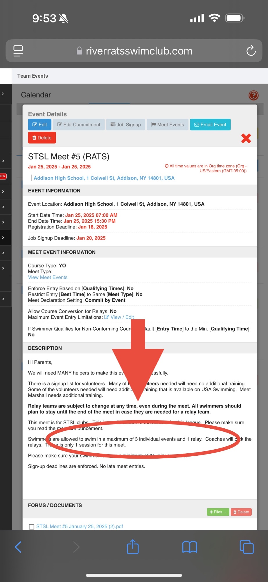 Please make sure to read the meet announcements PRIOR to signing your swimmer up for meets. in the "Parent Resources" section on the home page you can find a powerpoint explaining how to read a meet announcement. I have attached the powerpoint in the link below for refresher. Also this information can often be found right on the meet sign up page (see attached email). If you have any additional questions regarding meet announcements or meet sign ups please reach out. Finally, if you are not comfortable signing your swimmer up for specific events, you can always just "commit" your swimmer and coaches will sign up your swimmer for events. Thank you!
